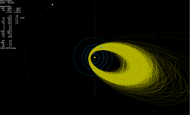 Obr. 2: Projekce drah meteoroidů náležejících meteorickému roji severních Taurid (NTA) v databázi EDMOND.