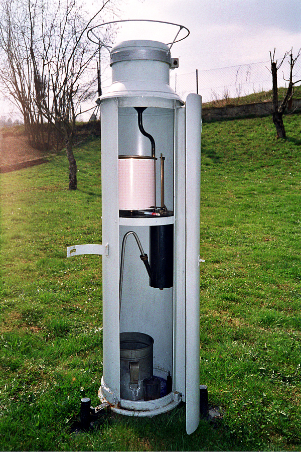 Přístroje v met. budce: zleva svisle suchý teploměr, vlhký teploměr, vlasový vlhkoměr, vodorovně maximální teploměr, pod ním minimální teploměr, vpředu vlevo termograf, vpravo hygrograf.
