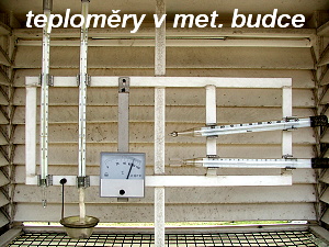 Umístění přístrojů v meteorologické budce. Zleva: staniční rtuťový teploměr, vlhký teploměr (podle teplot těchto dvou teploměrů se s pomocí tabulek zjistí vlhkost vzduchu, tlak vodních par a rosný bod), vlasový vlhkoměr, maximální teploměr a pod ním minimální teploměr.