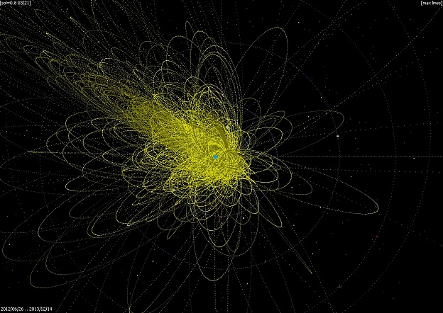 Obr.5.: Dráhy 673 vícestaničních Perseid ve Sluneční soustavě