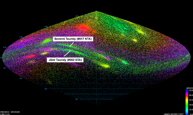 Obr. 1: Geocentrické radianty meteorů náležejících oběma větvím meteorického roje Taurid (#002 STA, #017 NTA).