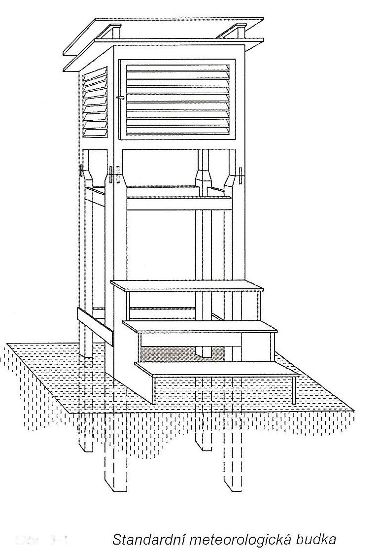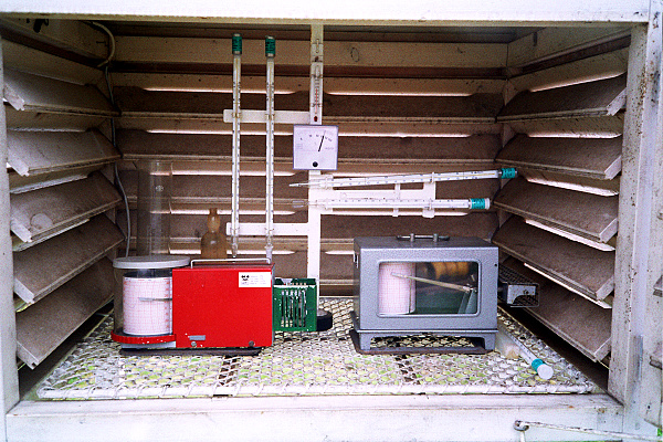 Přístroje v met. budce: zleva svisle suchý teploměr, vlhký teploměr, vlasový vlhkoměr, vodorovně maximální teploměr, pod ním minimální teploměr, vpředu vlevo termograf, vpravo hygrograf.