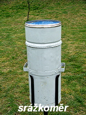 Srážkoměr k měření množství spadlých srážek. Jeho záchytná plocha je 500 cm2 a množství srážek zachycené srážkoměrem se měří v milimetrech. Platí, že 1 mm srážek ve srážkoměru = 1 litr vody na 1 m2 plochy.