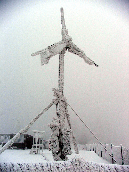 Námrazou obalená větrná elektrárna začátkem ledna